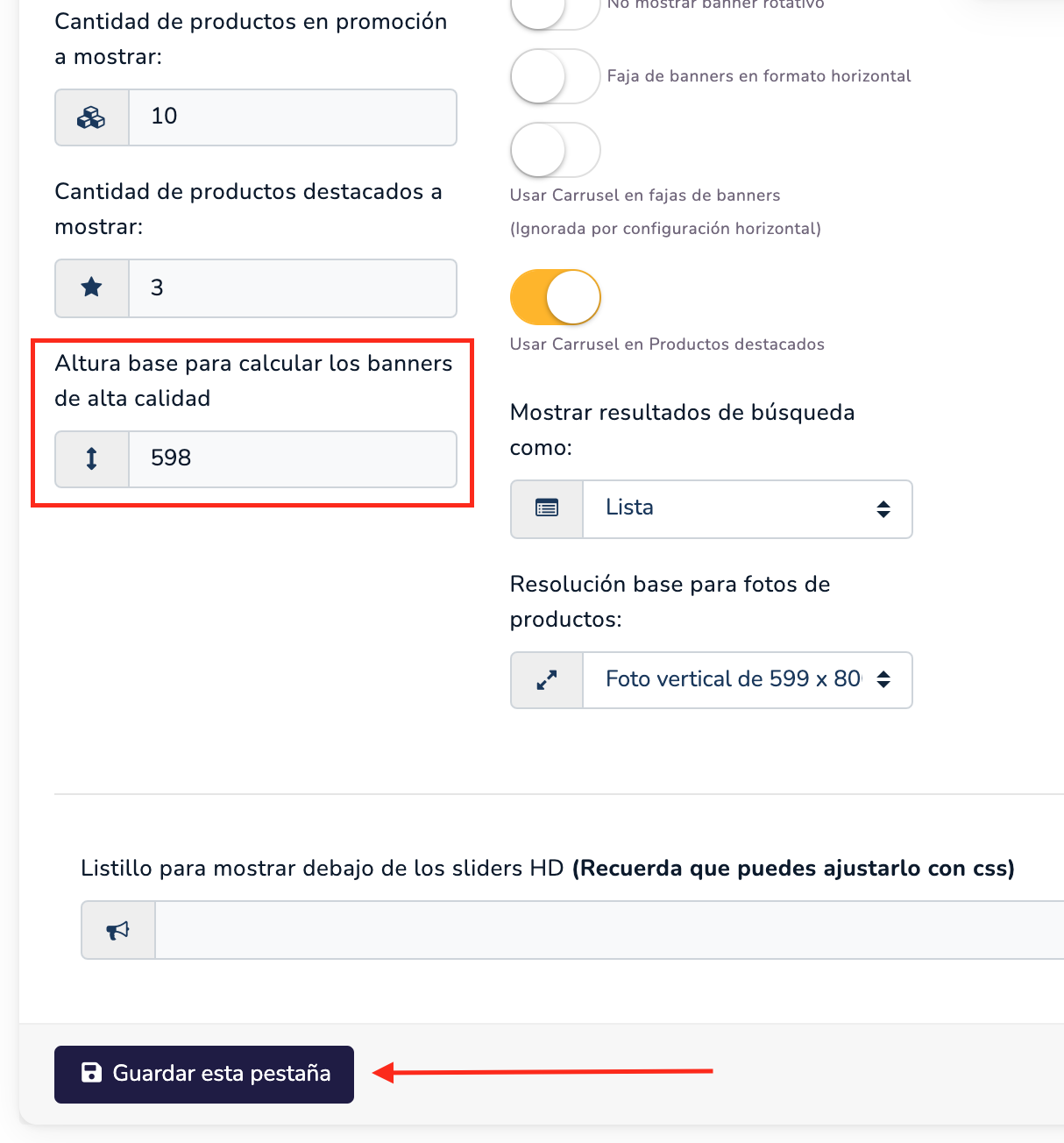 Presionar el botón Agregar banner subir el archivo con la siguiente medida, recuerde que el ancho del banner no cambia pero la altura la puede cambiar en el estilo de home altura para base de los banners.