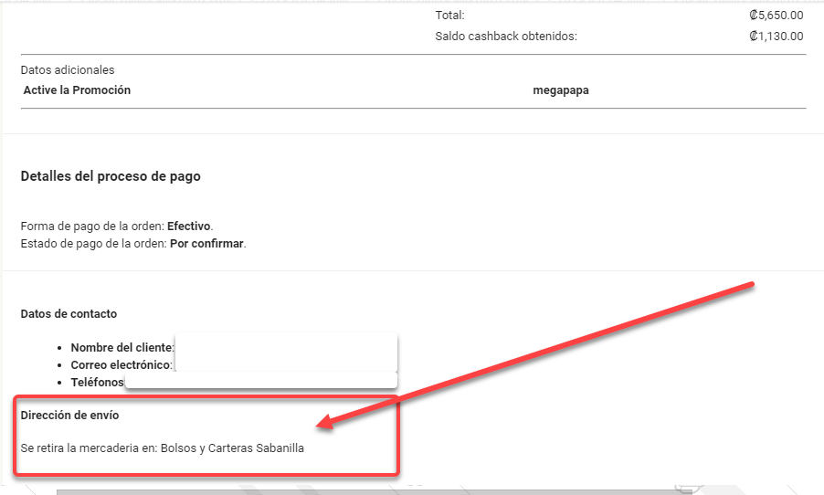 Cuando el comercio recibe la orden del pedido. En el pedido realizado se visualizará la opción información para envío donde se indicará, donde es que el cliente requiere retirar la orden de compra.