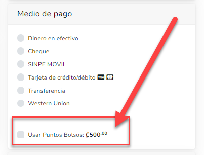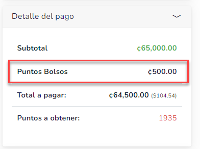 Una vez activo el botón para usar los puntos acumulados o el saldo que se compró de forma directa, en el carrito de compras se podrá ver la información del saldo. Si el monto por el cual se están usando los puntos es menor que el monto total de la compra, al usuario le va a aparecer el total o diferencia que debe de pagar.
