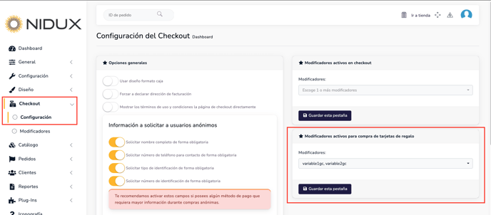 Para crear una diferenciación entre los modificadores para el checkout regular y para el checkout de las giftcards.
