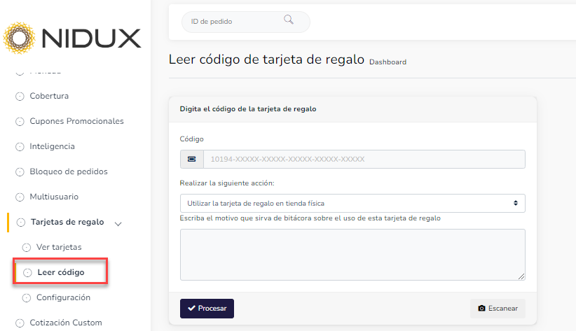 El nuevo apartado Leer código de tarjeta de regalo, nos trae ahora la opción de redimir la tarjeta en un punto físico o tienda local. Uno de los administradores de la tienda virtual debe de digitar el código de la tarjeta de regalo que el cliente le brinde para reconocerla. Luego elegir una opción en realizar la siguiente acción: