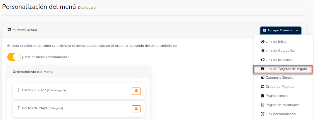 Este nuevo modulo tiene su propio checkout por lo que se debe de agregar desde el menú personalizado para que éste pueda estar visible en el menú de la tienda virtual, y los usuarios puedan adquirir las tarjetas de regalo o gift cards.