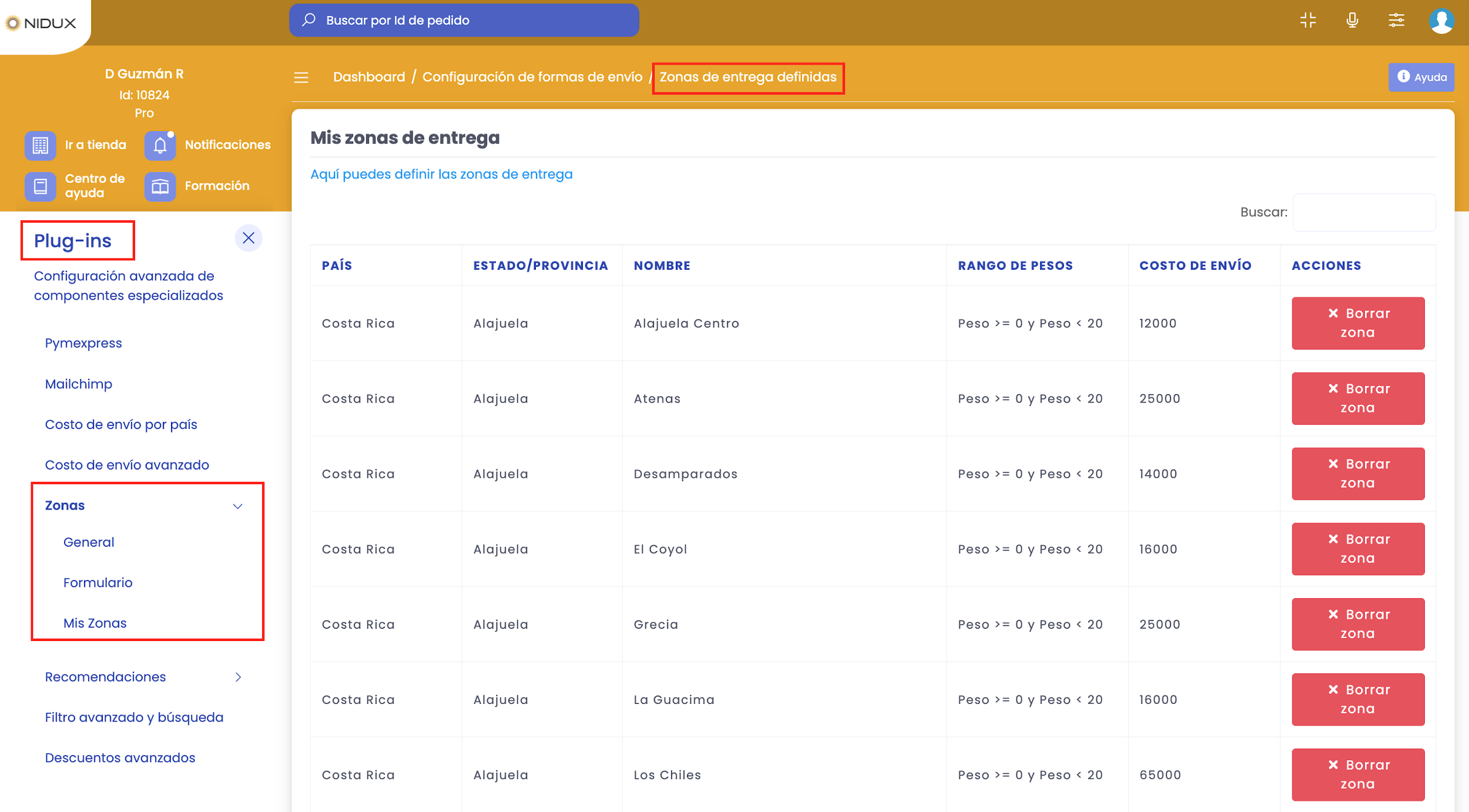 Usted debe de empezar a agregar las zonas que cubre según su dinámica (nótese que esto no es igual que Correos de Costa Rica), los administradores de tiendas virtuales, tienen diferentes proveedores de logística y el cliente no debe o tiene que saber con cual empresa le llega el producto, ya que esto difiere si son flores, chocolates, cajas, muebles etc y/o del momento, de si se trata de una emergencia o no del comprador.