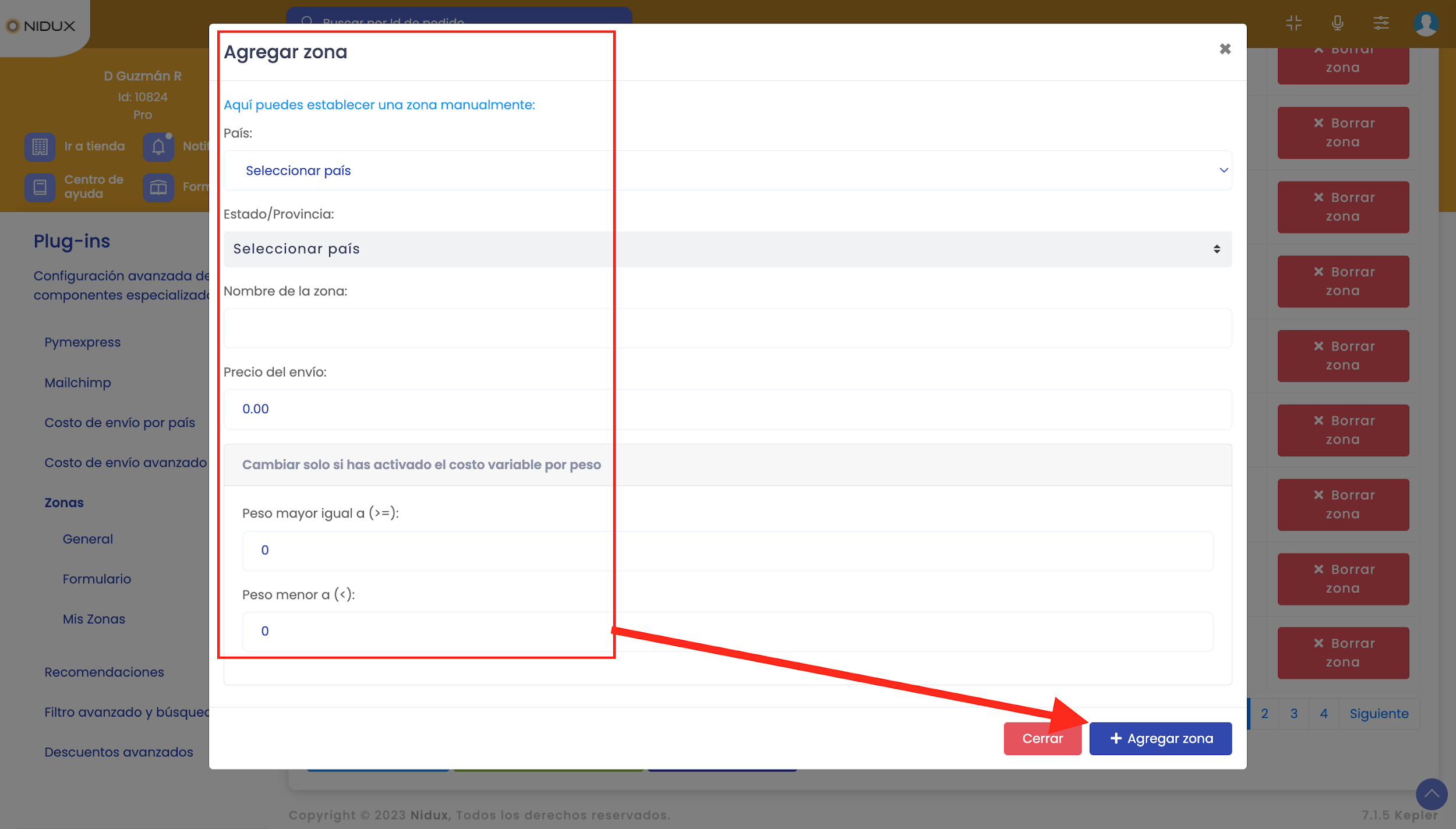 Para conocer mejor el proceso de creación de las zonas dentro del admin lo ideal es agregar una zona por cada Provincia, ya que las provincias generan un id o estado, que para trabajarse de forma masiva es importante reconocer, y estos sólo se generan desde el admin NIDUX.
