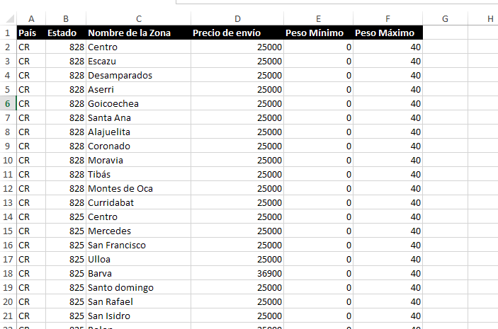 Adjunto podrás encontrar una plantilla de Zonas con la puedes trabajar y sobreescribir en la misma los diferentes pesos y precios según sea necesario en tu modelo de negocio.